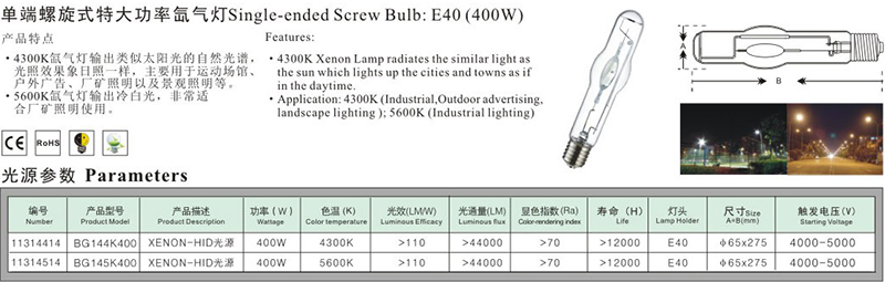 单端螺旋式特大功率氙灯E40(400W)